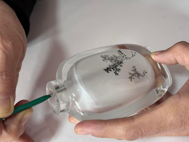 内画属于那一类门槛极高的艺术。艺术家需要用极细的内画笔深到瓶口内部深处来作画,由于瓶口狭小,而内部空间很大,这就要求艺术家在笔杆有极大“束缚”的情况下,笔尖要么大幅度拉出线条,要么极其灵活地勾勒出细节……对于内画这门艺术,业界的共识是,三五年刚刚入门,十年才有小成,二三十年才能画出有自己风格的作品。