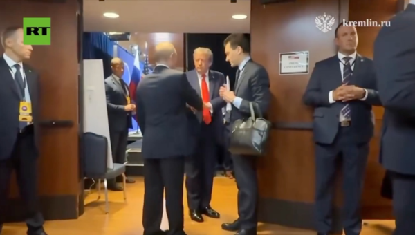 特朗普与普京握手并“轻松闲聊”。图源:俄媒视频截图